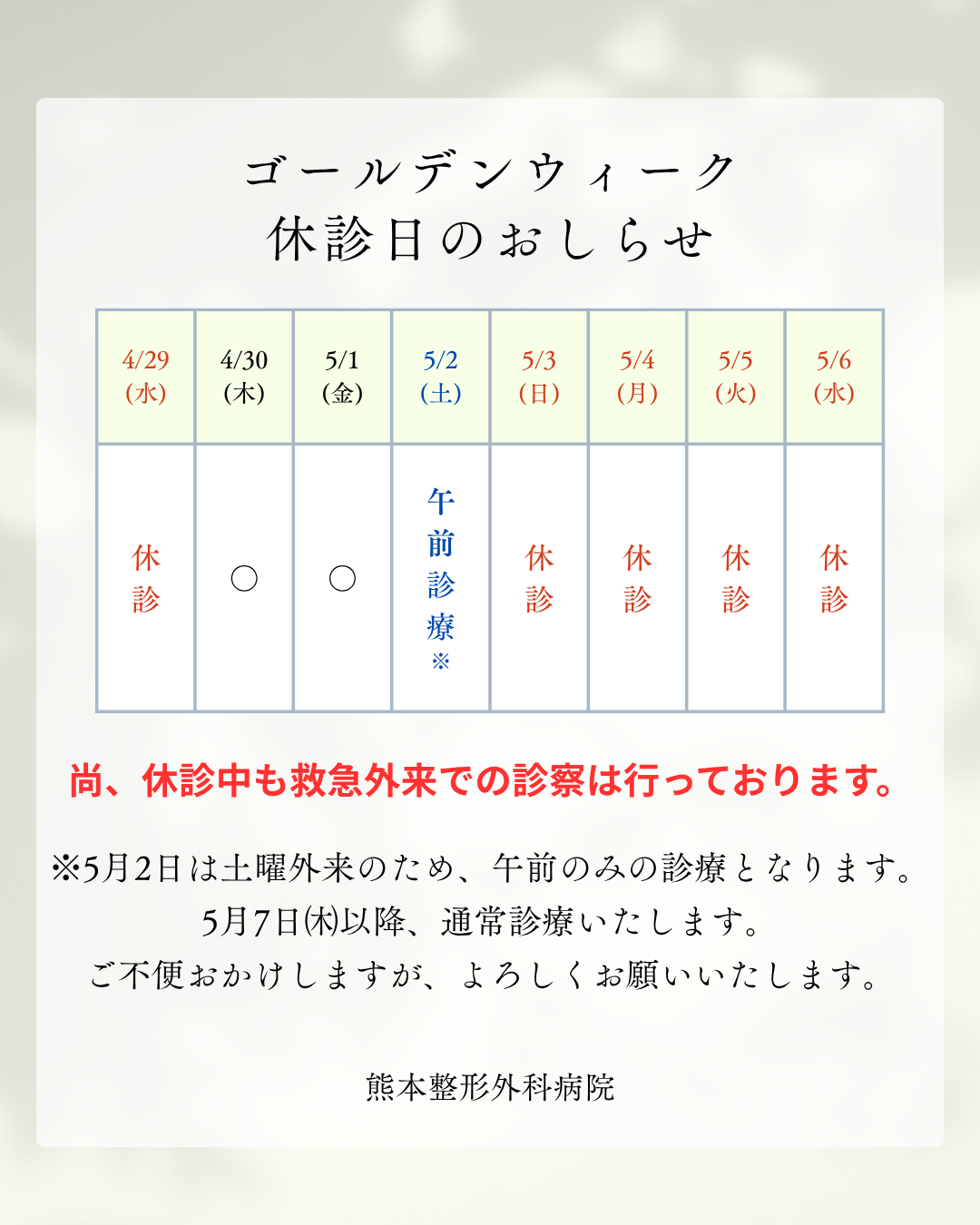 ゴールデンウイーク休診日のお知らせ